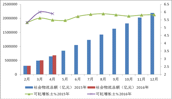 ----工業品物流需求增速回落。1-4月,工業品物流總額,按可比價計算,比上年同期增長5.8%,增速與一季度基本持平,但比上年同期回落0.4個百分點。4月當月增長6.0%,比3月回落0.8個百分點。