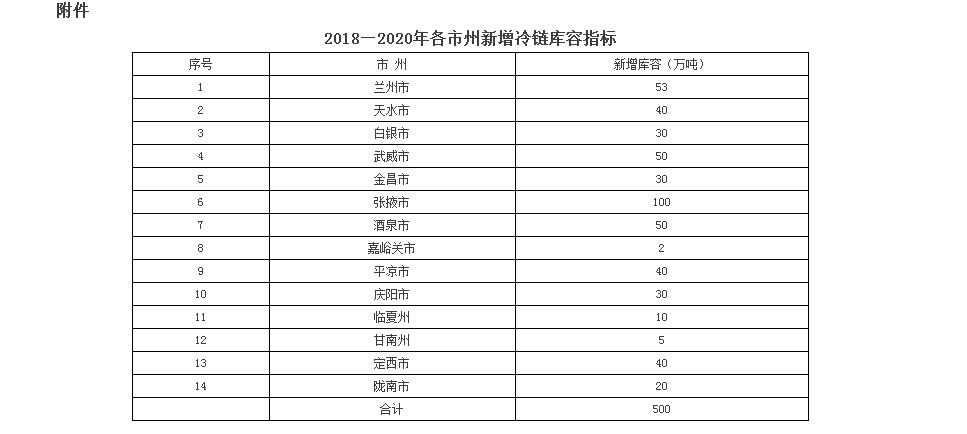。ㄒ唬┲С纸ㄔO產地預冷集配中心。在農產品集散地,建設一批冷庫庫容2000噸以上的集散和收儲中心。在蘭州、白銀、定西市,以高原夏菜、百合、馬鈴薯、中藥材等為重點,新增各類冷鏈高溫庫庫容60萬噸;在金昌、武威、酒泉、嘉峪關、張掖市,以高原夏菜、洋蔥等為重點,新增各類冷鏈高溫庫庫容180萬噸;在天水、平涼、慶陽、隴南市,以蘋果等為重點,新增各類高溫庫庫容120萬噸。(責任單位:省商務廳、省發展改革委、省農牧廳、省供銷聯社,各市州政府、蘭州新區管委會)