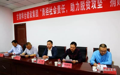 捐贈會上,公司負責人說:去年以來,祥合集團積極響應成縣委、縣政府脫貧攻堅的總體部署,主動參與和助力全縣打贏脫貧攻堅戰,在改善居住條件、扶持產業、解決就業給與了力所能及的幫扶。今后,集團公司將牢記企業社會責任,認真落實企業建立的"董事長掛帥、經理人結對、黨職員包戶"的幫扶脫貧責任制,倒排時間節點,緊盯幫扶任務,不折不扣地對照需求和問題清單,因戶施策和對接落實,為全縣脫貧不斷作出新貢獻,為成縣經濟社會發展不斷奉獻新力量。