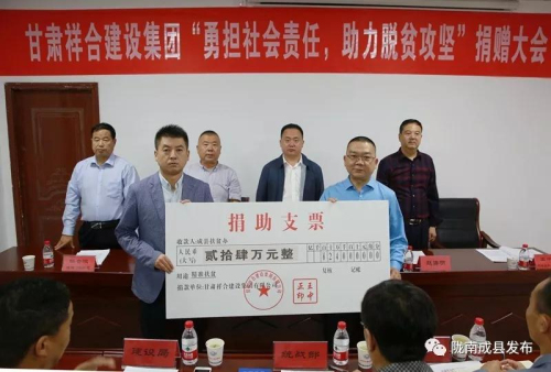 9月11日,甘肅祥合集團公司召開"勇擔社會責任、助力脫貧攻堅"捐贈大會。本次新捐贈幫扶資金24萬元,主要用于宋坪鄉、城關鎮、紙坊鎮、拋沙鎮、沙壩鎮的貧困村幫扶及37戶特殊困難群眾。