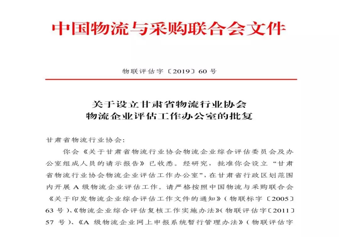 5月20日,中國物流與采購聯合會正式批準設立“甘肅省物流行業協會物流企業評估工作辦公室”,在甘肅省行政區劃范圍內開展A級物流企業評估工作。年內,評估辦已組織10家企業通過3A和4A級物流企業評估。