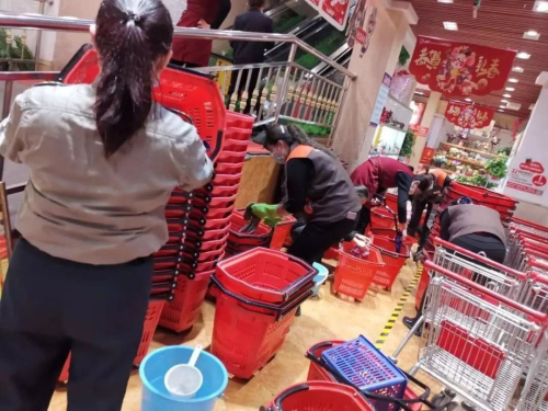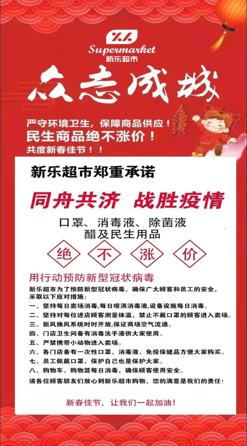 迅即行動(dòng),全面防疫。按照各級(jí)政府安排部署,新樂(lè)集團(tuán)旗下超市從臘月二十八起就全面啟動(dòng)應(yīng)急預(yù)案,采取各項(xiàng)防疫防范措施。所有門店每日營(yíng)業(yè)前、營(yíng)業(yè)中和閉店后都會(huì)對(duì)購(gòu)物車筐、電梯、地面、公共用品、設(shè)施設(shè)備等進(jìn)行徹底消毒處理;所有員工配戴安全防護(hù)裝具,每日進(jìn)行體溫監(jiān)測(cè)和身體消毒;在各家超市醒目處張貼各類溫馨提示,普及各種防疫知識(shí);堅(jiān)持對(duì)所有進(jìn)店顧客進(jìn)行體溫測(cè)量,禁止不戴口罩人員進(jìn)入賣場(chǎng)。通過(guò)系列措施,為廣大市民提供了安全、健康、放心的購(gòu)物場(chǎng)所。