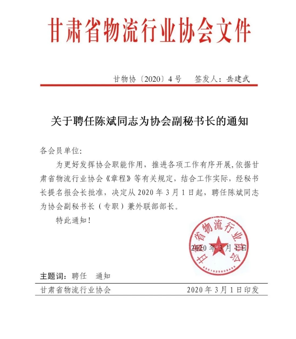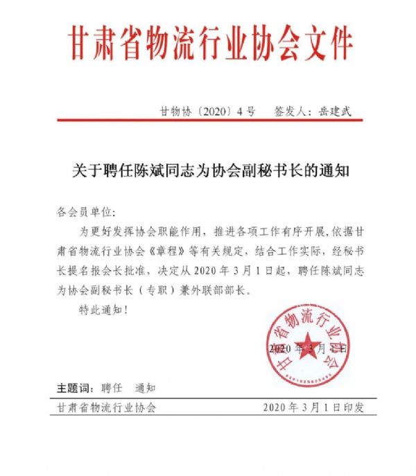 關于聘任陳斌同志為協會副秘書長的通知