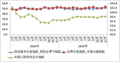 2018-2019年物流業(yè)景氣指數(shù)、中國倉儲指數(shù)、中國公路物流價格指數(shù)走勢