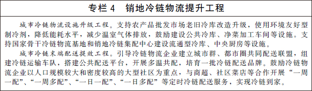 加快商貿冷鏈設施改造升級。推動農產品批發市場冷庫改造,配套建設封閉式裝卸站臺等設施,完善流通加工、分撥配送、質量安全控制等功能。鼓勵商超、生鮮連鎖店加大零售端冷鏈設施改造升級力度,提高冷鏈物流服務能力。引導城市商業街區、商圈、農貿市場共建共享小型公共冷庫。淘汰關停不合規不合法冷庫。