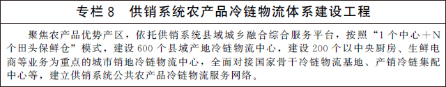 完善高品質生鮮消費品下行通道。結合新型城鎮化建設,促進消費品下鄉進村通道升級,推動冷鏈物流服務網絡向中小城鎮和具備條件的農村地區下沉,加快推進“快遞進村”工程,鼓勵供銷、郵政快遞、交通運輸、電商等企業共建共用冷鏈物流設施,打通高品質生鮮消費品下鄉進村新通道,擴大生鮮等高品質消費品供給。