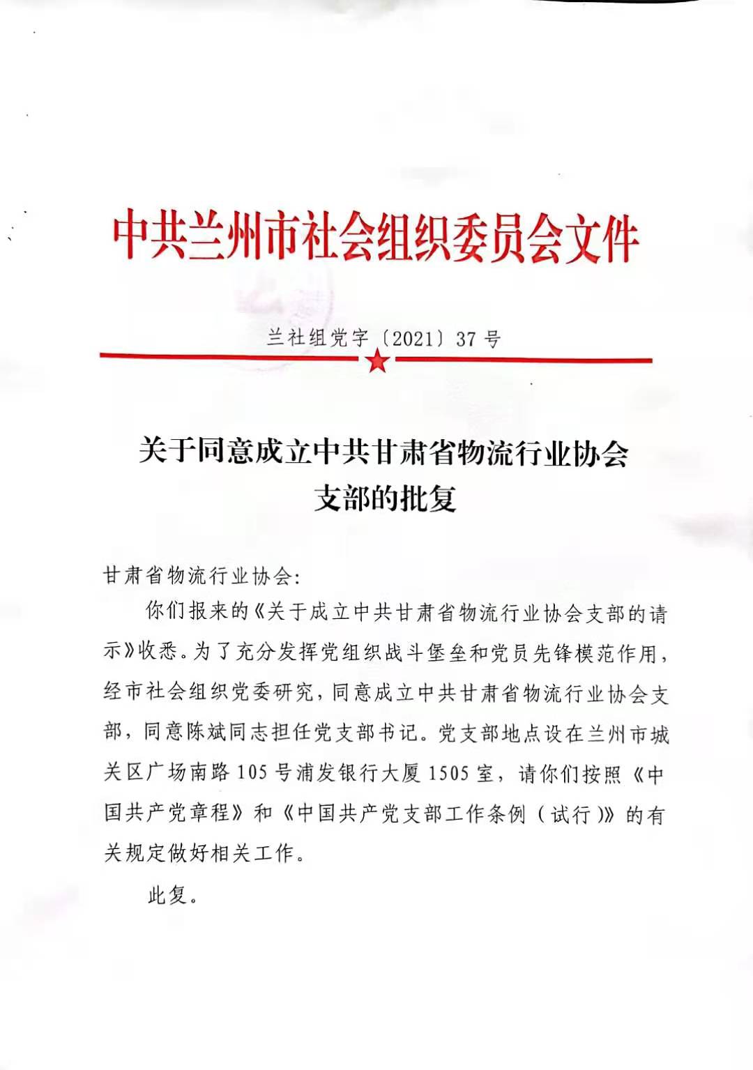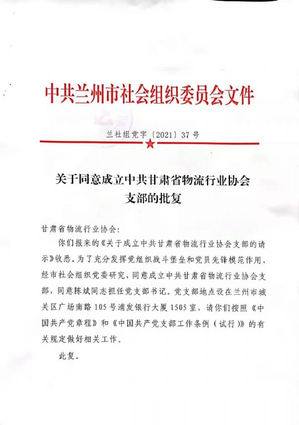 關(guān)于同意成立中共甘肅省物流行業(yè)協(xié)會支部的批復(fù)